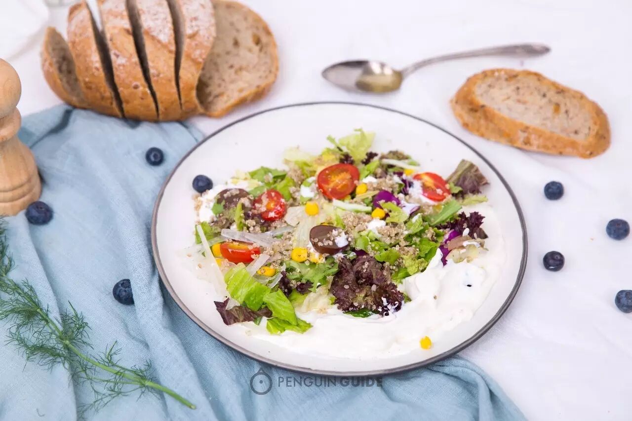 舀出两三勺稠厚的希腊酸奶,再淋上几滴香气四溢的金黄色橄榄油,就有了一盘吃起来毫不干涩,却比油醋热量还低的沙拉。