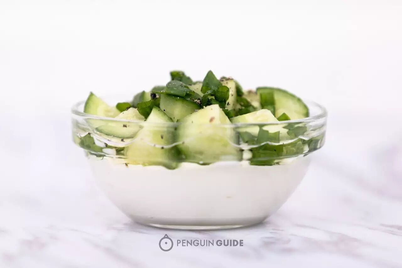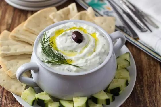 食材:希腊酸奶、黄瓜、大蒜、盐、橄榄油、红酒醋、莳萝