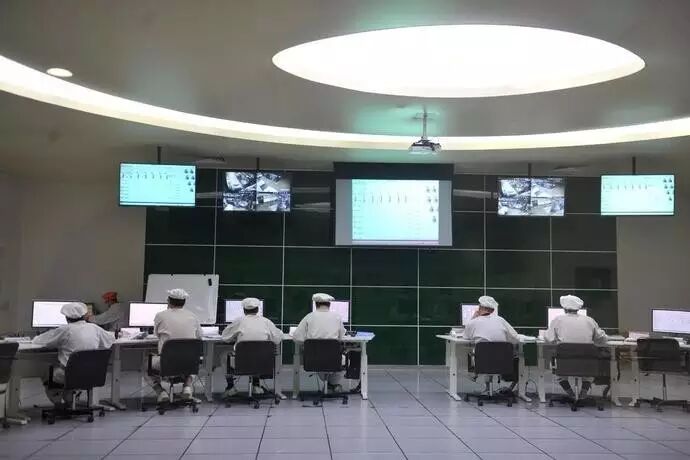 ,几名技术人员坐在电脑前,点击鼠标操作电脑对前处理生产车间设备进行控制管理,车间设备正常运转。