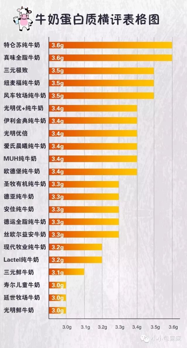 前面说了蛋白质含量越高越好,所以我把这些牛奶依据蛋白质含量做了一个排序,蛋白质含量最高的是特仑苏和真味全脂牛奶,都是3.6g/100ml,最低的是光明鲜牛奶、韩国延世和寿尔儿童牛奶,均为3.0g/100ml,从蛋白质含量看,国产和进口牛奶没什么差别。