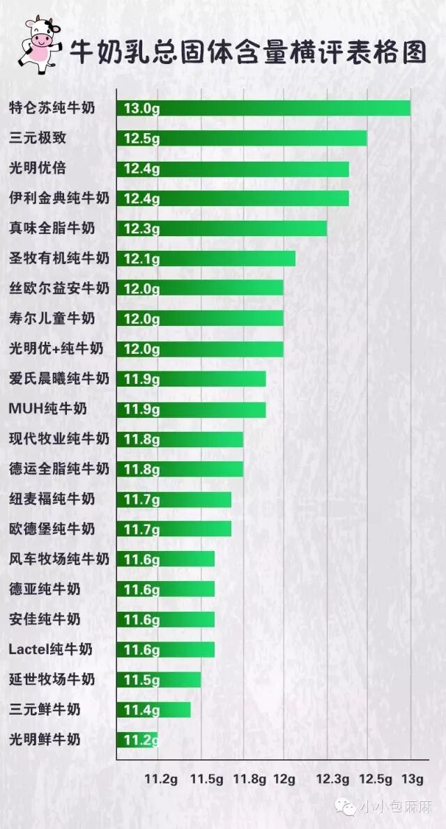 前面我们说了乳总固体含量很重要,接下来我们就来看看这些牛奶的乳总固体含量排序,看看这些牛奶中的“干货”有多少。