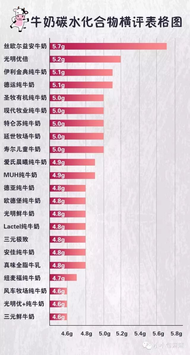 牛奶中的碳水化合物就相当于牛奶里的糖,所以这项指标妞们也是要关注的。这次买到的牛奶碳水化合物含量在4.6-5.7g/100mL之间,最高的是丝欧尔益安牧场牛奶,最低的是三元鲜牛奶。