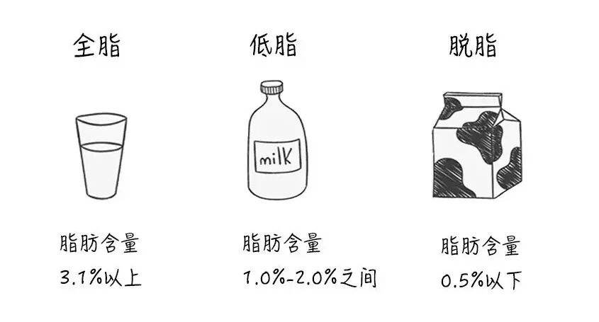 全脂牛奶是最接近纯牛奶的牛奶,营养相对全面,脂肪含量在 3.1%以上。脱脂牛奶和低脂牛奶是对牛奶中的脂肪进行了全部脱去或部分脱去的牛奶,脂肪含量在0.5-2%。