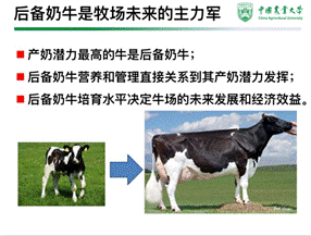 优质后备奶牛培育综合配套技术》(农科办2014第9号)和国家标准《后备奶牛饲养技术规范》(报批稿)为支撑技术,深入开展后备奶牛培育关键营养和饲养技术体系示范与推广。