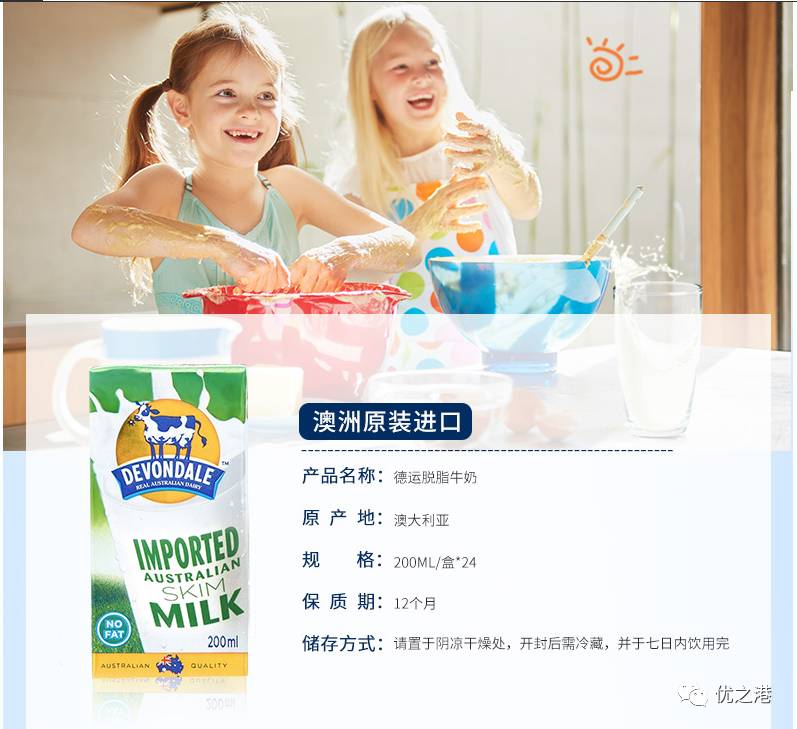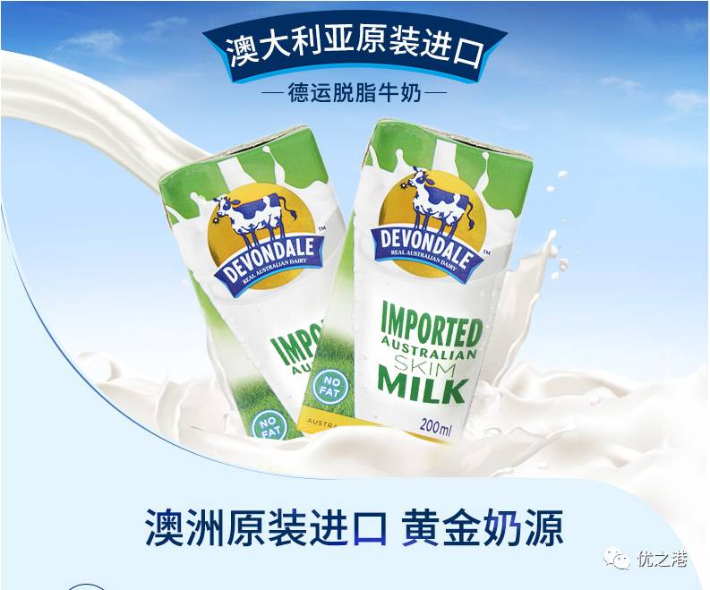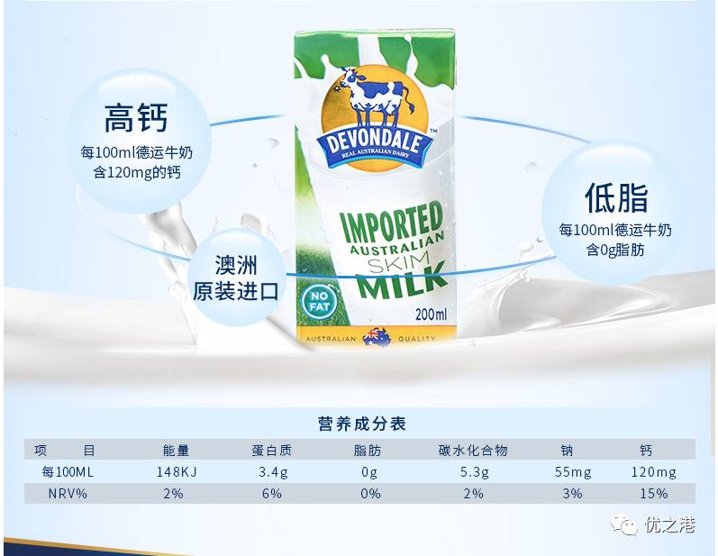 Devondale 德运脱脂牛奶全部来自澳大利亚天然牧场,60多年来德运一直致力于生产高品质的奶制品。本品富含钙质和蛋白质,0脂肪,奶源纯正,口感醇香。这款脱脂的奶粉热量低,适合减肥的人,胆固醇高的人,健康营养。