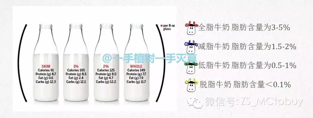 全脂,减脂,低脂,脱脂是基于每100克牛奶中脂肪含量的多少来界定的:(牛奶图片来自互联网,由@一手植树一手灭草结合来自wikipedia 维基英文版的数据整理:)