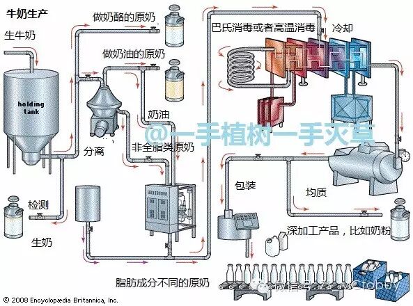 1. 上图的分离工程为油脂和乳汁离心分离,剩余的脂肪含量决定全脂,减脂,低脂和脱脂牛奶