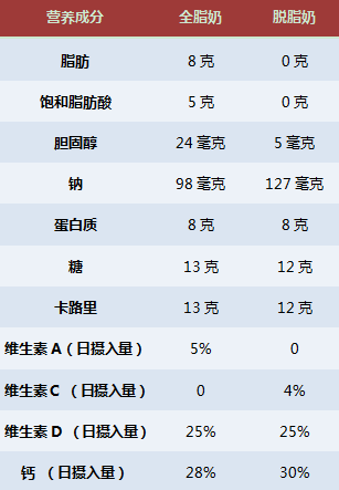 一杯240毫升的全脂奶与脱脂奶,营养成分有什么区别?看看下面这个表格。