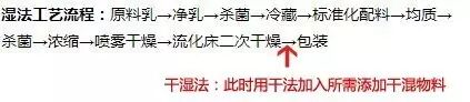 湿法工艺,将牧场或奶源地收集到的新鲜牛(羊)乳2小时之内降到0—4度,进行各种标准化作业处理后,加入各种营养素,经混合溶解、杀菌、喷雾干燥、包装、检验、出厂的一种工艺。