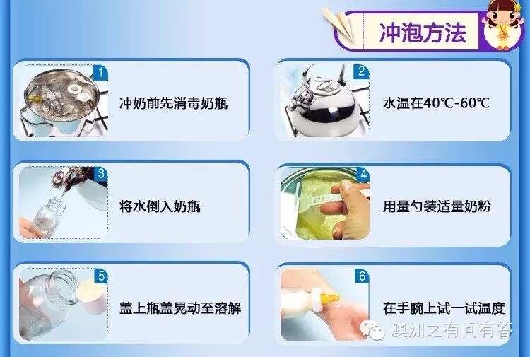4、喂养前,把奶液滴在手腕上试温,冲调好马上喂养(不要贮存),喂完后多余奶液请丢弃。