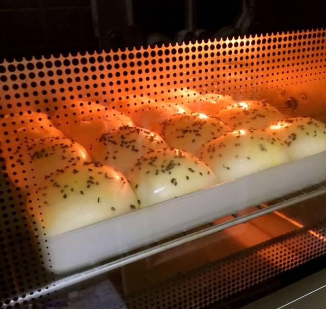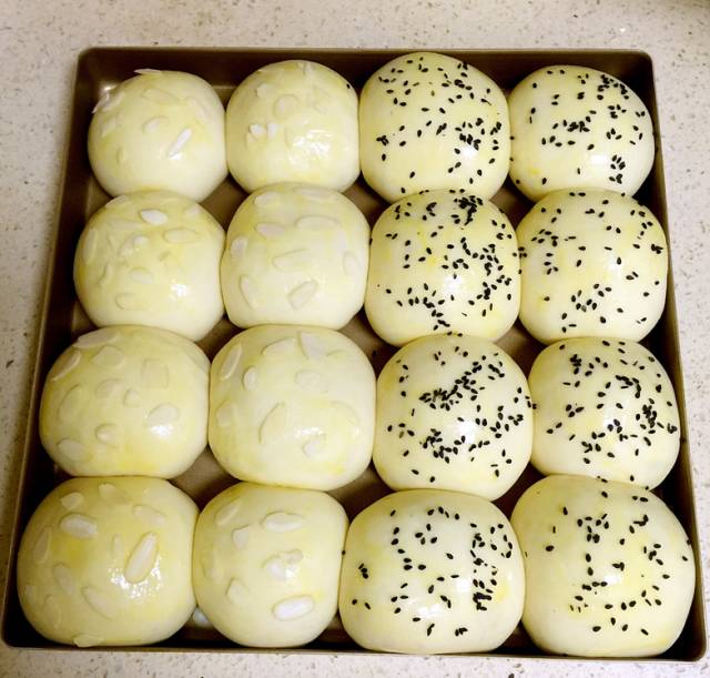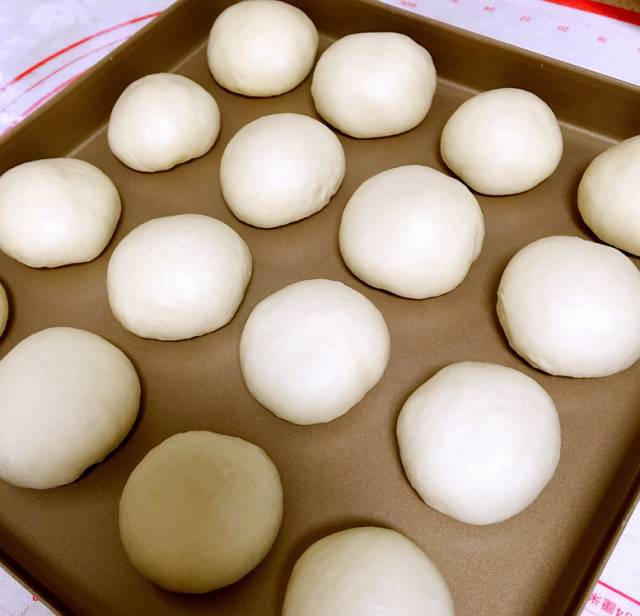 6.把每一个小面团分别揉圆摆入方形烤盘(我的烤盘是三能28*28),面团与面团之间要留有空隙。可以根据自己的喜好包入豆沙馅或者肉松馅。全部做好后,放入烤箱发酵至1.5-2倍大。