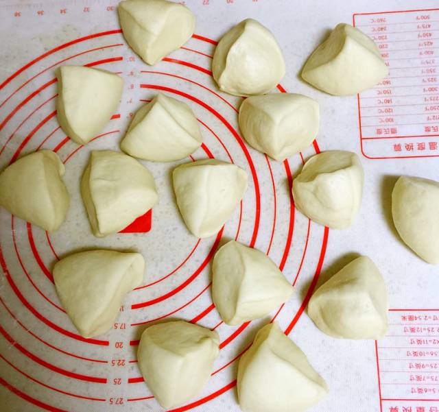 5.发酵好的面团取出按压排气,平均分割成16份。