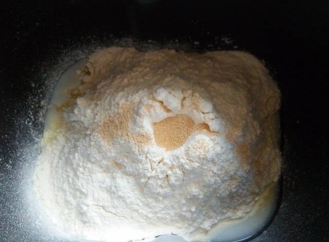 1. 除黄油外,所有面团材料放入面包机桶,先放液体,然后左角放盐,右角放糖,最后放高粉,在高粉上挖个坑埋入酵母,启动面包机和面程序
