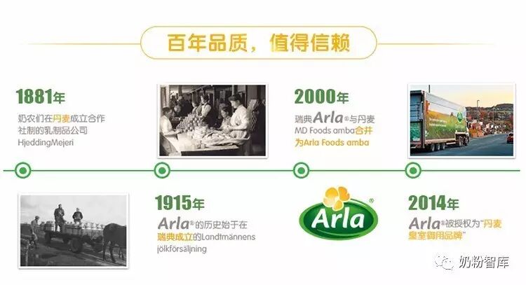 Arla 成立于1881年,迄今已有130多年历史,长久以来都是丹麦皇室的乳品供应商,在2014年被授为“丹麦皇室御用品牌”。此外,Arla 在荷兰合作银行发布的"2016年全球乳业20强"中排名第七。