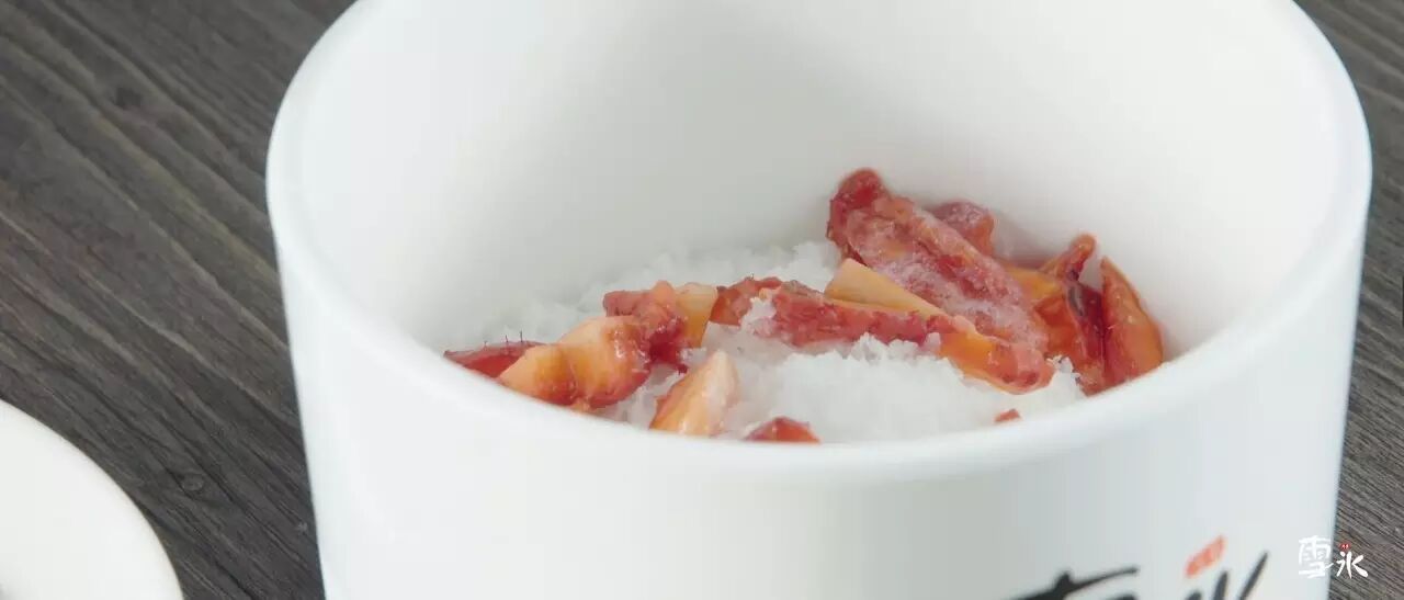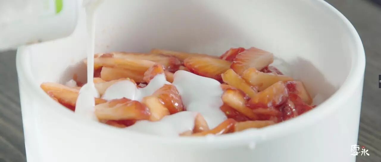 撒上一层酸奶味的冰,将草莓条放在冰上。