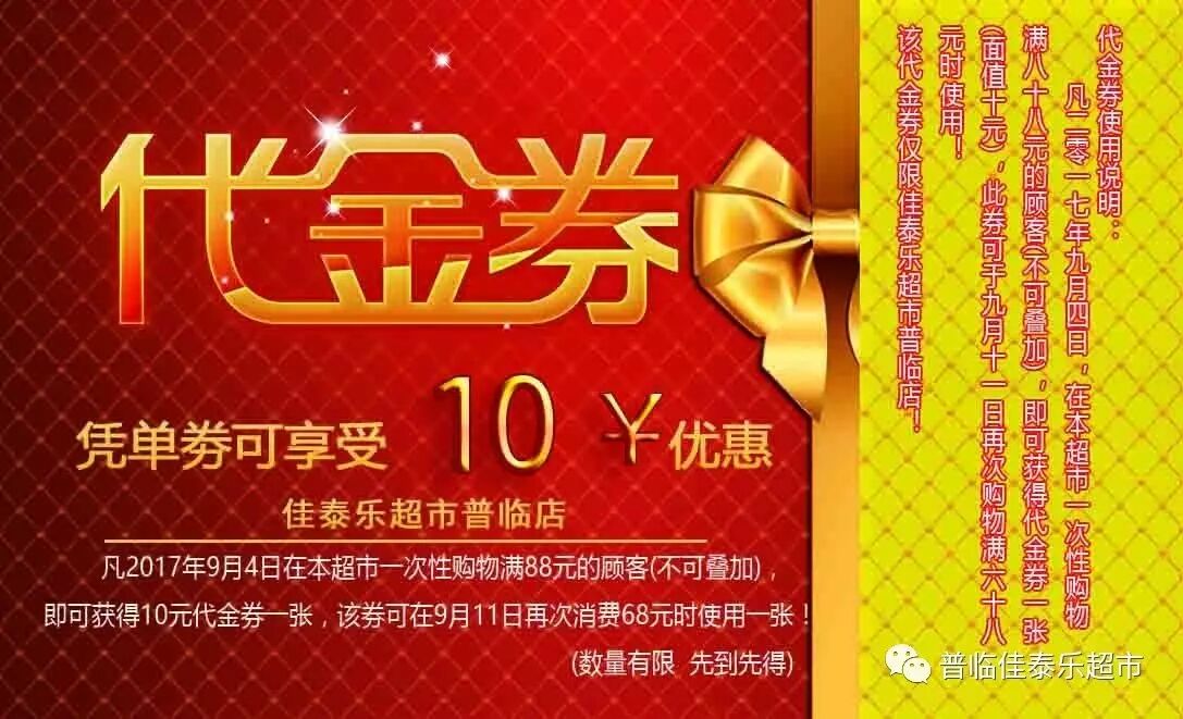 凡2017年9月4日在本超市一次性购物满88元的顾客(不可叠加),即可获得10元代金券一张,该券可在9月11日再次消费68元时使用一张!