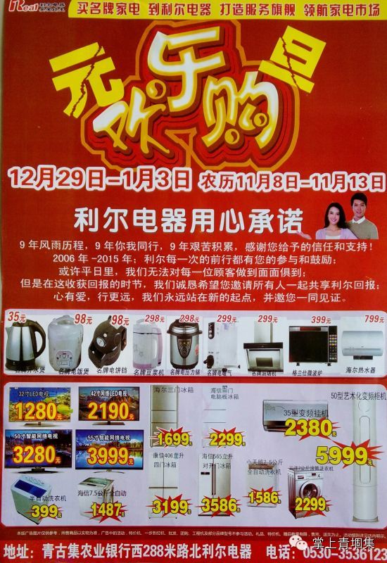 利尔电器元旦乐购 购物抽大奖 一等奖1名:名牌洗衣机 二等奖5名:名牌电磁炉 三等奖10名:名牌开水煲 四等奖若干名:精美茶具 中奖率100% 咨询电话:3536123
