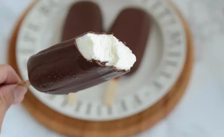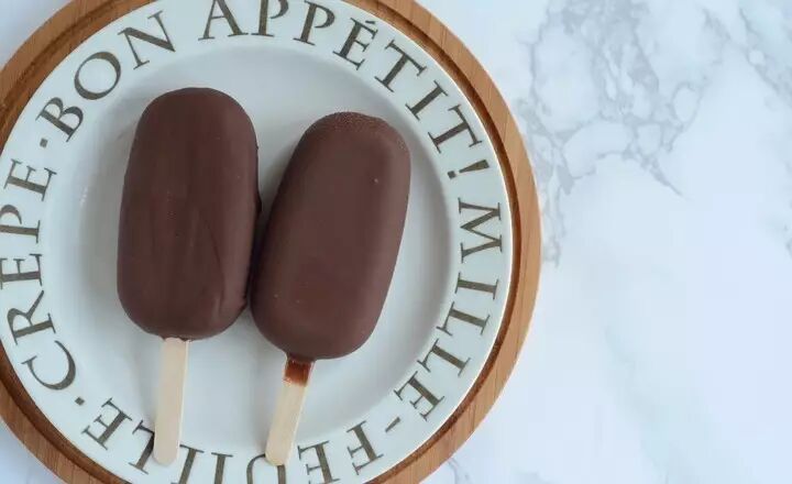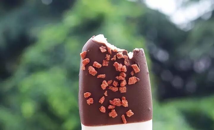 ④如果喜欢巧克力脆皮,可以用好时脆皮酱来做快手脆皮——把脆皮酱挤到杯子里,将脱模后的雪糕插入脆皮酱,立即取出即可。因为雪糕很冰,所以脆皮酱会迅速凝固成脆皮。还可以在表面撒一点果干,如草莓干之类的,会很好看哦~