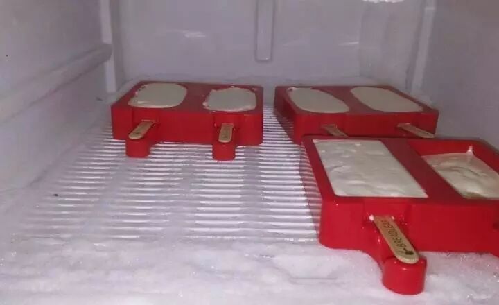 ③将酸奶淡奶油糊倒入雪糕模。震几次模,排出大气泡。如果表面不平的话,用小刮刀刮一下。冷冻3小时及以上,即可脱模食用~