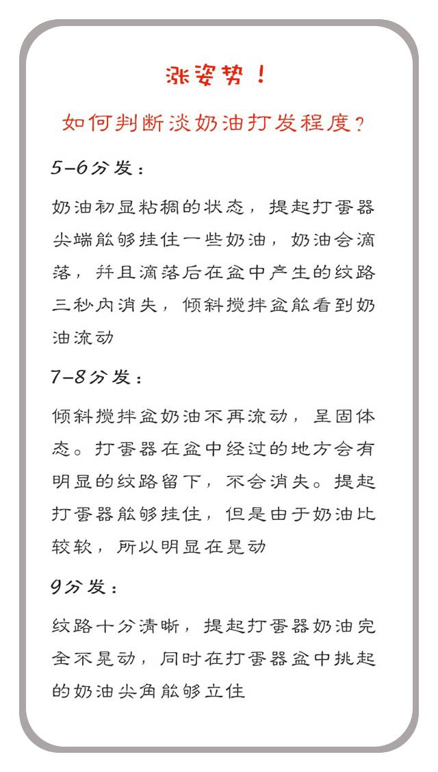 ①淡奶油加糖,打发至6-7分,就是出现纹路,但还可以流动的状态。(打发程度可以灵活调整,见tips)