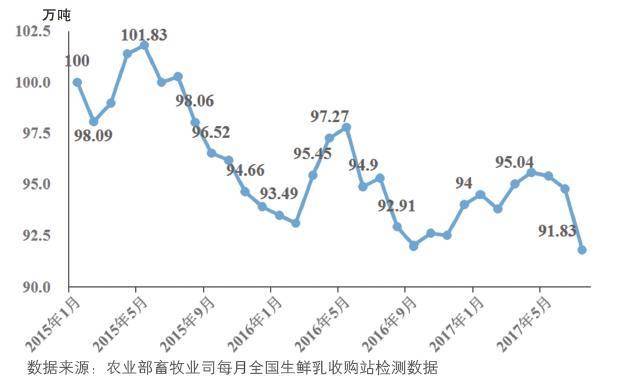 2015年1月为基期,从2017年4月起,国内生鲜乳产量不断下降(图1),7月生鲜乳产量同比减少3.76%,环比减少2.95%;1~7月累计生鲜乳产量同比减少0.98%。