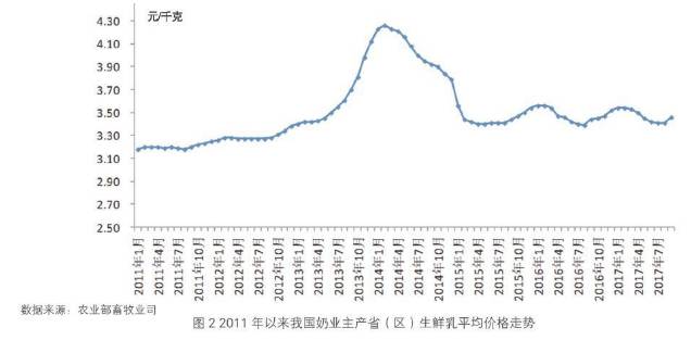 尽管产量下降,生鲜乳供给量有所减少,但奶价持续处于低位,直到9月,奶价开始反弹。,2017年9月,内蒙古、河北等10 个奶业主产省(区)生鲜乳平均价格为3.46 元/千克,环比略上涨1.47%,同比仅上涨0.59%。
