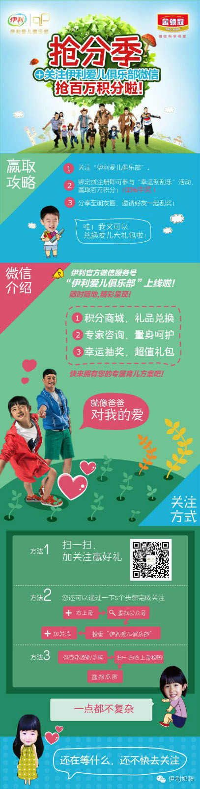 咳~咳~咳~伊利爱儿俱乐部官方微信今天上线啦,以后小伙伴们只要打开微信就能获取第一手的专家育儿信息,用积分兑换礼品,还能参加精彩活动。小伙伴们现在关注或围观就能参加“幸运刮刮乐”活动赢取百万积分,百分之百中奖哦~