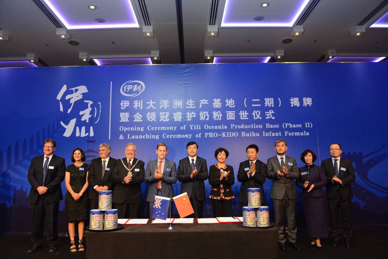 伊利集团董事长兼总裁潘刚(左起第六位)与新西兰驻华使馆商务投资参赞 Ivan Kinsella、新西兰怀马特市市长 Craig Rowley、、、新西兰奶农代表等共同见证大洋洲乳业与中国经销商代表签署金领冠睿护奶粉首批订单合约。