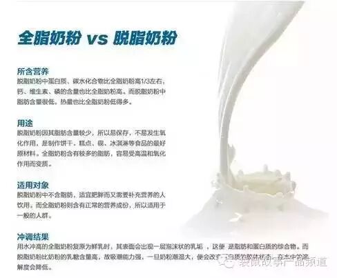 脱脂奶粉中不含有脂肪,适合补充营养而又肥胖的人饮用。而全脂奶粉则含有奶粉正常的营养成分,所以适用用一般的人。