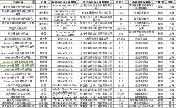 乳制品方面,有4批产地为澳大利亚的巴氏杀菌乳被检出不合格。由上海东展国际贸易有限公司进口的1批乔尼牧场蓝臻雷克特区巴氏杀菌乳被检出大肠菌群超标,由绿地众选(上海)国际贸易有限公司进口的1批澳兰吉小镇全脂巴氏杀菌乳被检出菌落总数超标,由绿地众选(上海)国际贸易有限公司进口的1批澳兰吉小镇部分脱脂巴氏杀菌乳被检出大肠菌群超标、菌落总数超标,均被销毁。10批次产地为西班牙的Quescrem奶油干酪因超过保质期被销毁,进口商为上海汉森环宇进出口有限公司。