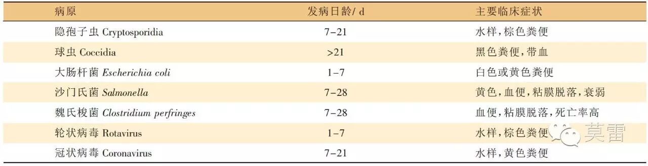 表1 不同病原体引起的犊牛腹泻发病日龄和主要临床症状发病