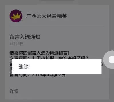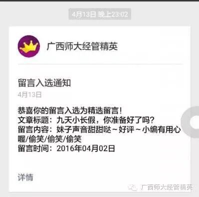 在公众号推送图文结尾留言并入选,将默认成功积累一条【精选留言】,以收到【留言入选通知】为准,如下图: