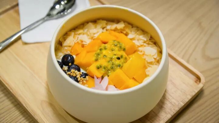 乍一看以为自己掉进了热带果园,像在吃一份自助水果~基底用了新疆酸奶,上层有香脆的椰子皮,芒果、蓝莓、香蕉、百香果~酸甜口味,搭配混合坚果,清爽的口感可以缓和一下前面甜品的甜腻。