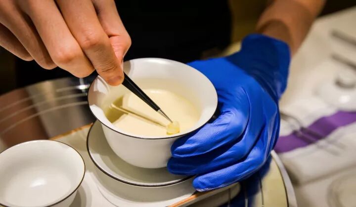 奶冻的表面如镜面一般光滑剔透,没有丝毫杂质,根本不忍用勺子破坏它,只有一朵茉莉做装饰,外观素雅,但其工序却极其耗时,要先将虾针茶叶冷泡48小时(因为冷萃比较不易释出苦涩来源的茶碱,热泡虽然可以马上享受茶叶的香气,但喝完回味会有微微苦涩的口感)最后用高温将虾针原液和两种混合淡奶迅速融合,具体配比都是由Jiabin经过数次尝试调配而成。