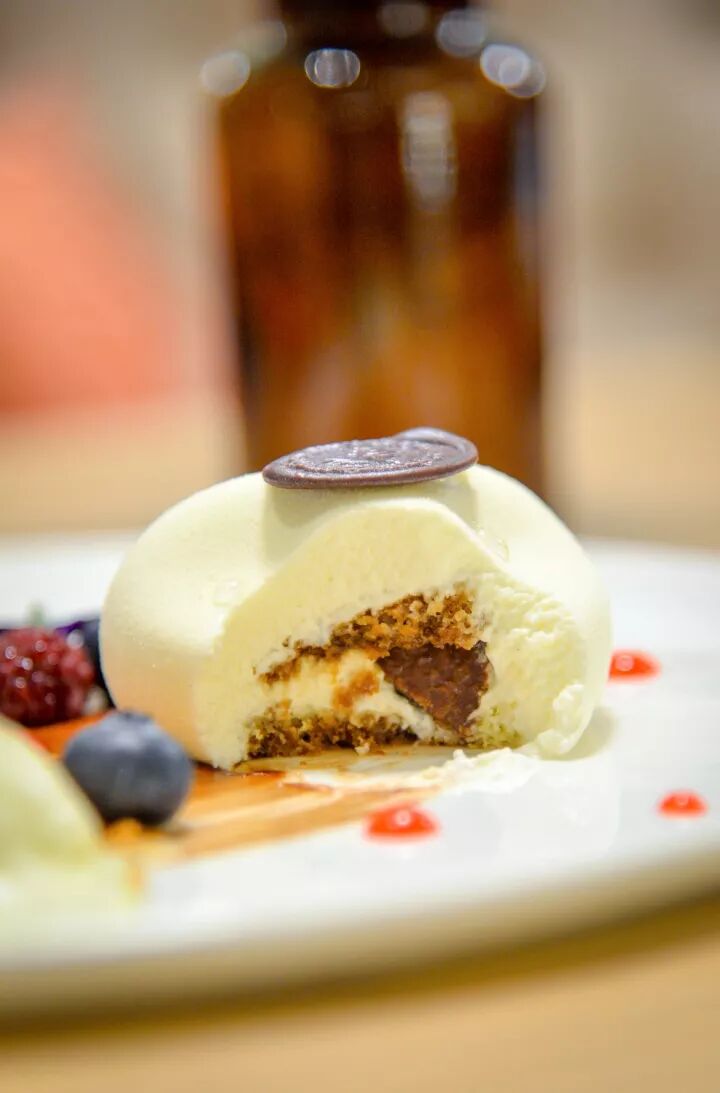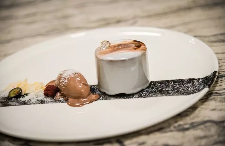 而重头戏的大理石同样口感丰富,别具质感的大理石纹理(一不小心纹路就会花掉,所以非常考验甜品师的水平)第一口口感细腻,当你往中间探索,又会发现Jiabin给你的小惊喜,藏于其中的卡仕达酱,又增加了丰富的口感。