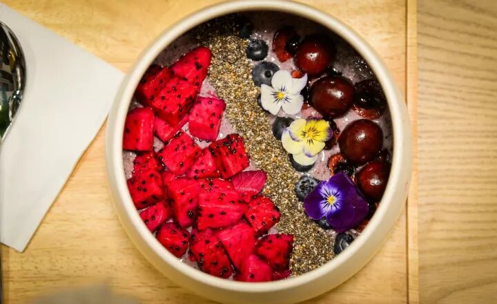 镇店之宝!底部是巴西莓和酸奶混合制作的果昔基底,而上层还铺满了奇亚籽和火龙果加上蓝莓车厘子以及可食用三色堇。