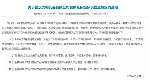 近期,湖北省食药监局对武汉光明乳品有限公司检查结果显示,该企业生产的7种规格的复原乳产品中,160克红枣发酵乳复原乳标注不醒目。武汉光明乳品有限公司已被湖北省食药监局要求企业整改。