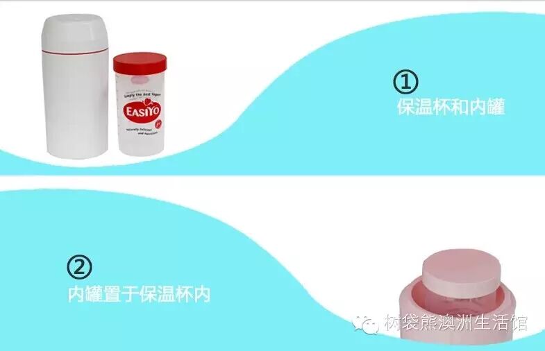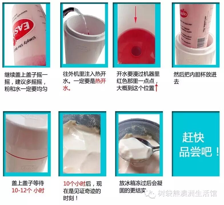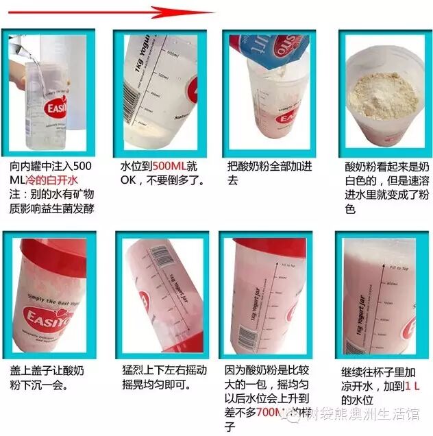 在内罐中加入500ml冷水→将整袋配套酸奶粉全部倒入内罐中→充分摇匀,再加水至1000ml,拧紧内罐盖子→将红色配件放进外罐中,加入开水,至红色配件顶端→将内罐放入外罐中→将外罐盖子盖紧→放置8-10小时(切勿放入冰箱)→直至酸奶完全凝固→取出内罐放到冰箱冷藏,即可食用。