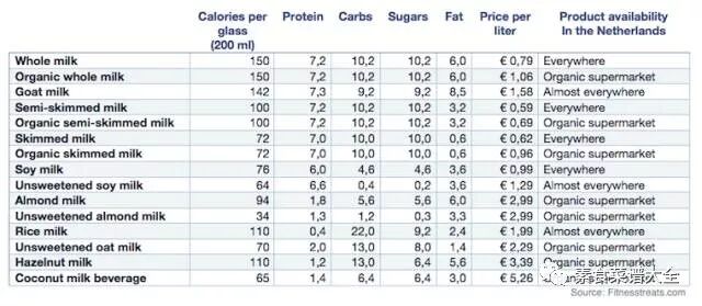 这里比较了豆浆、杏仁奶、米浆、榛子奶和椰奶,其中豆浆蛋白质含量最高。
