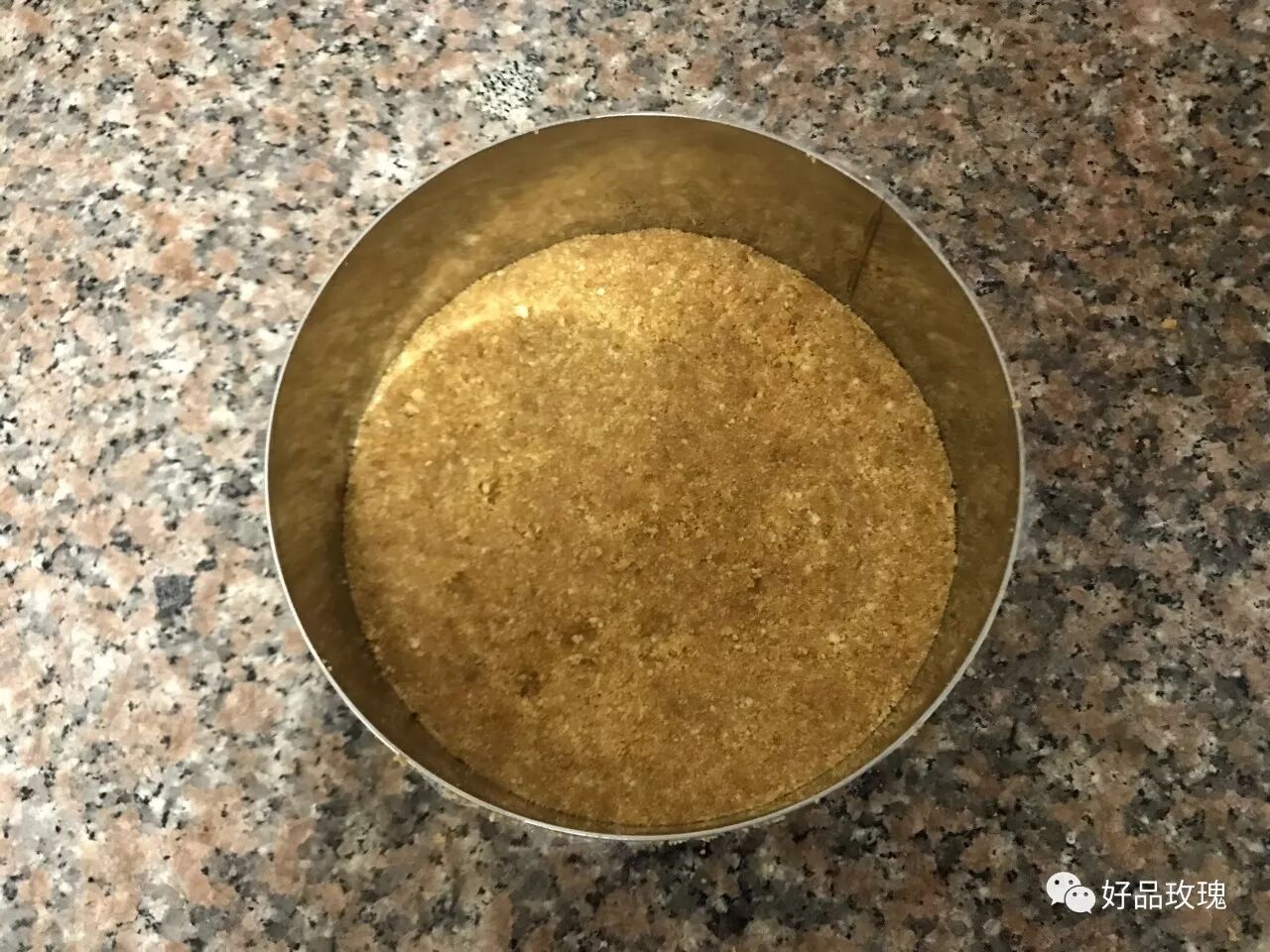 5. 将搅拌好的饼干底倒入模具中,用手或勺子压实,放入冰箱冷藏30分钟