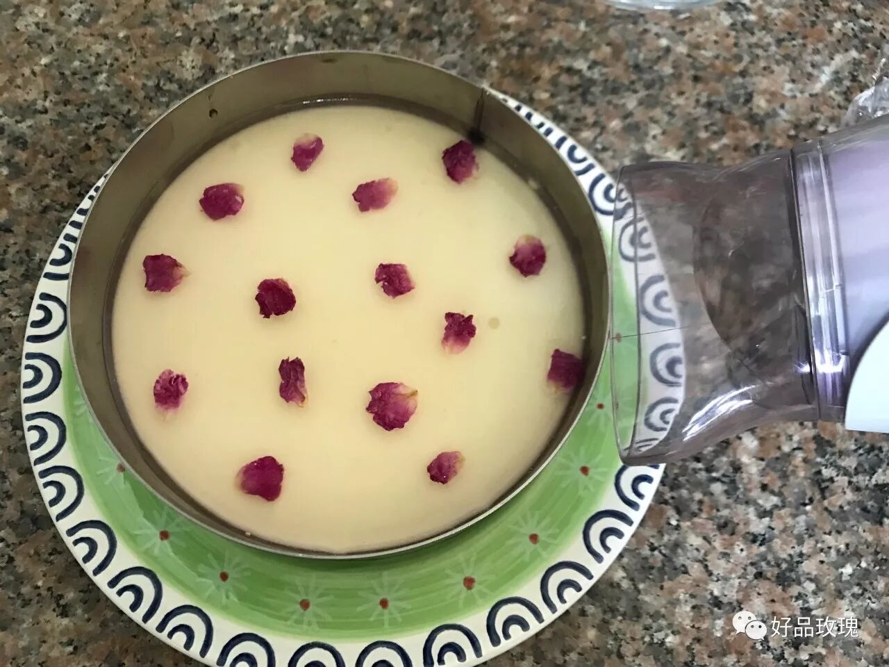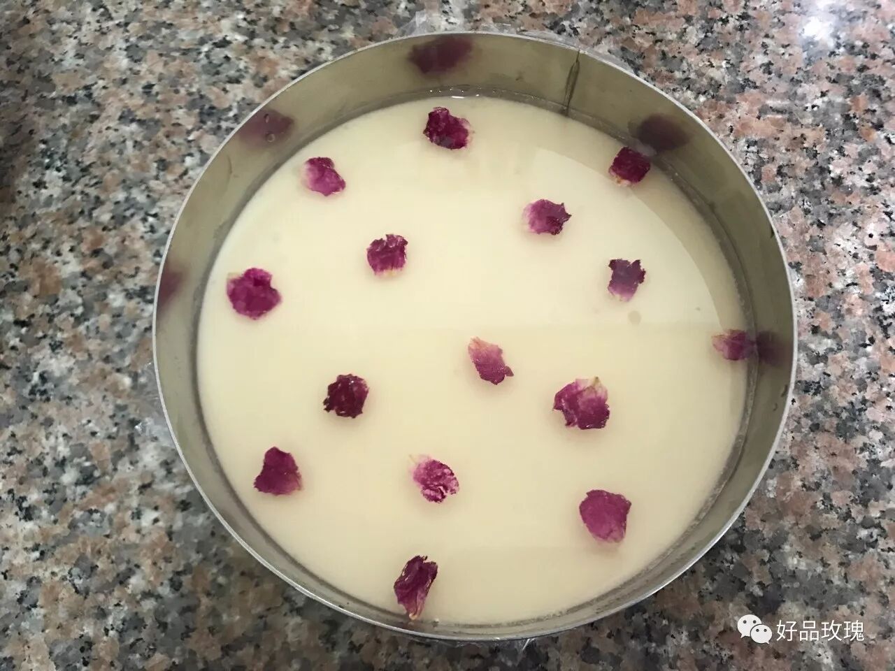 2.作为装饰镜面用的玫瑰花瓣不要泡太软,否则颜色变淡不漂亮。玫瑰花瓣要完全浸没在吉利丁液体里,成品的效果才好看。