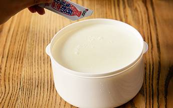 从冰箱中取出1小袋发酵剂,常温放置约15分钟,加入到纯牛奶中,搅拌至少半分钟至混合均匀,可根据喜好加入适量白糖。