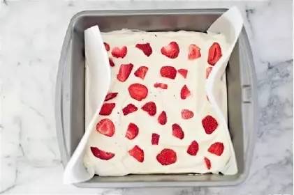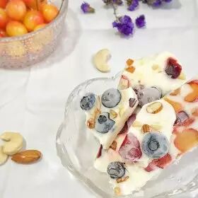 撒上准备好的水果和坚果,放入冷冻层4小时左右,直到完全冻硬