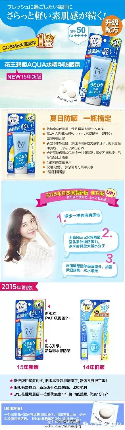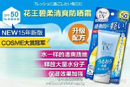 #5.7周四预告#上午10点半【2015日本最新Biore碧柔防晒霜】日本COSME大赏冠军,亲民又好用的防晒!创新的新型态水感防晒,涂抹时释放大量水分子,让清爽感大幅提升,更添加玻尿酸成分,清爽不油腻,让妳几乎忘了擦过防晒。也可当妆前隔离,用普通洗面奶就可以洗掉,无需卸妆,更方便!团47.9包邮~