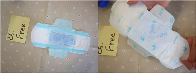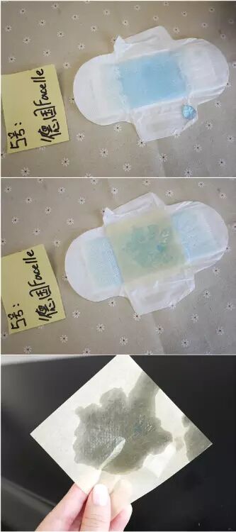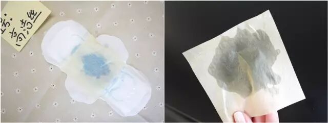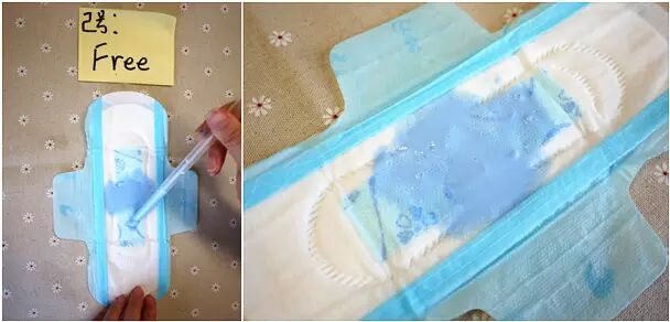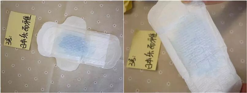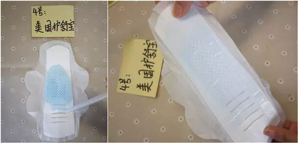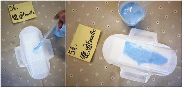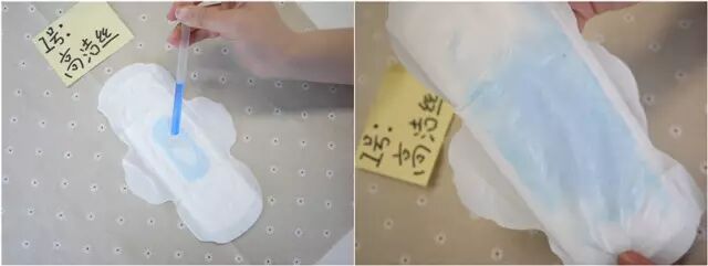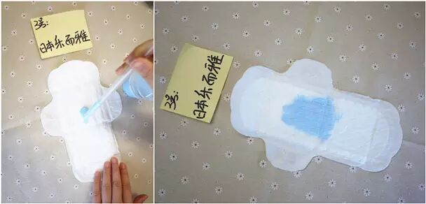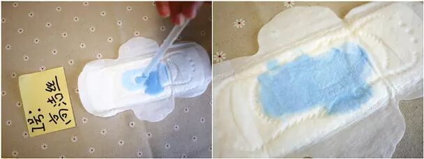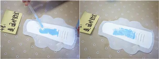 测试方法:混合水+墨水作兑成蓝色液体(红色的你敢看吗?),每块卫生巾用吸管注入同等量的液体,为了可以更明显看出效果,我们用吸水纸在表面轻按,吸水纸越透明,说明吸水程度越差。