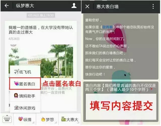 纵梦惠大前天推出了表白墙功能,收到了许多同学的真情表白,注意!都是匿名哦~经过筛选后,我们就推送惠州学院第二期表白墙,让我们一起祝福一起助攻吧!GOGOGO~