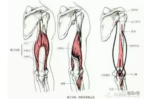 长头起自肩胛骨盂下结节,外侧头起自肱骨体后面桡神经沟外上方,内起自桡神经沟内下方。