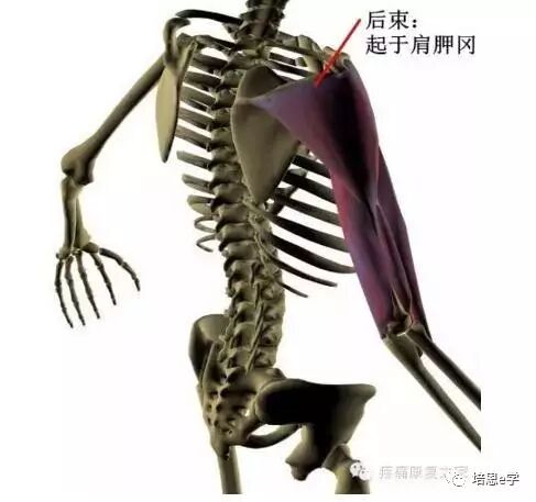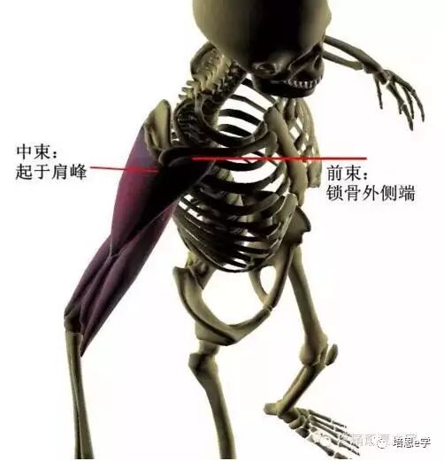 起点:前部肌束起自锁骨外侧端,中部肌束起自肩峰,后部肌束起自肩胛冈。