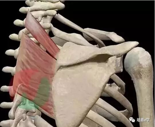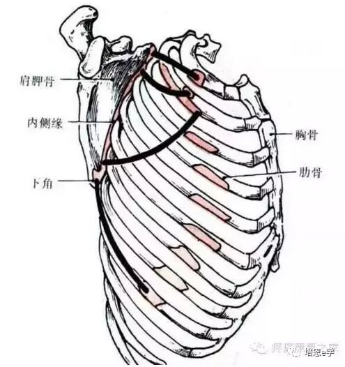 肩胛骨内侧缘:菱形肌(背面 止)、前锯肌(肋面 止)