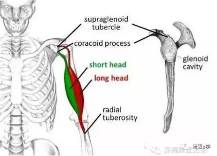 喙突上有三块肌肉:喙肱肌(起)、肱二头肌短头